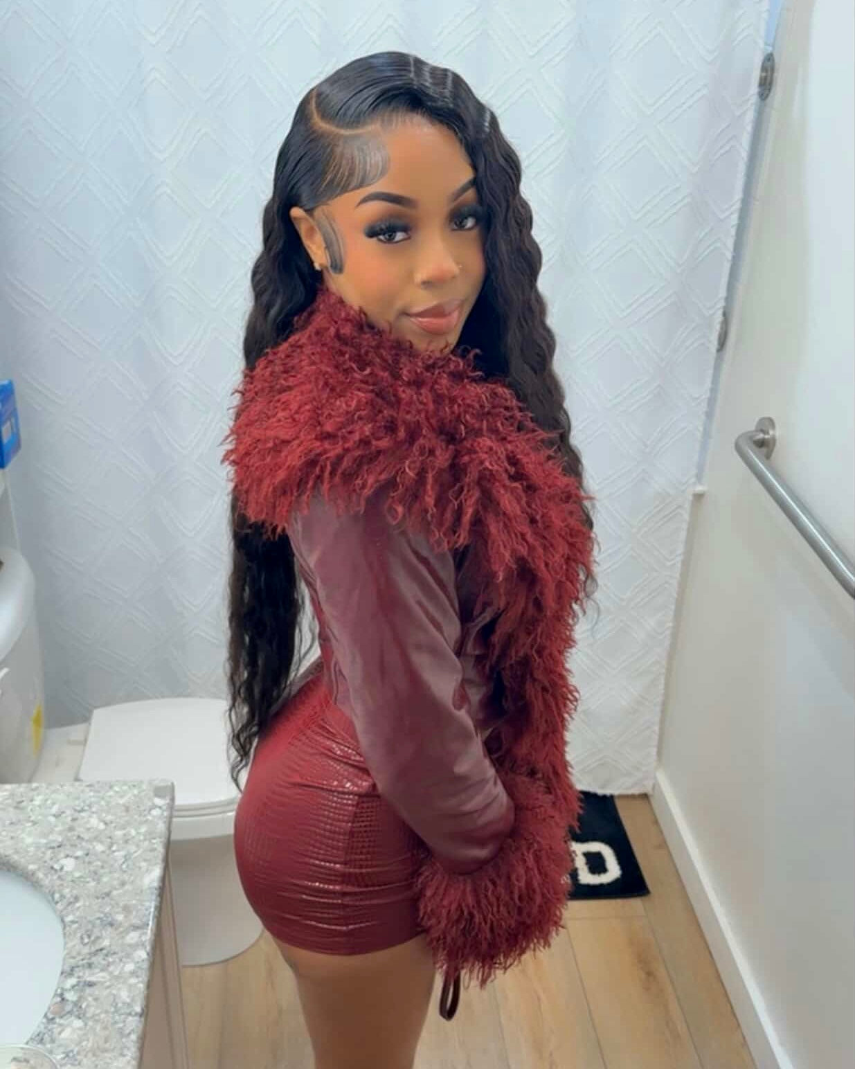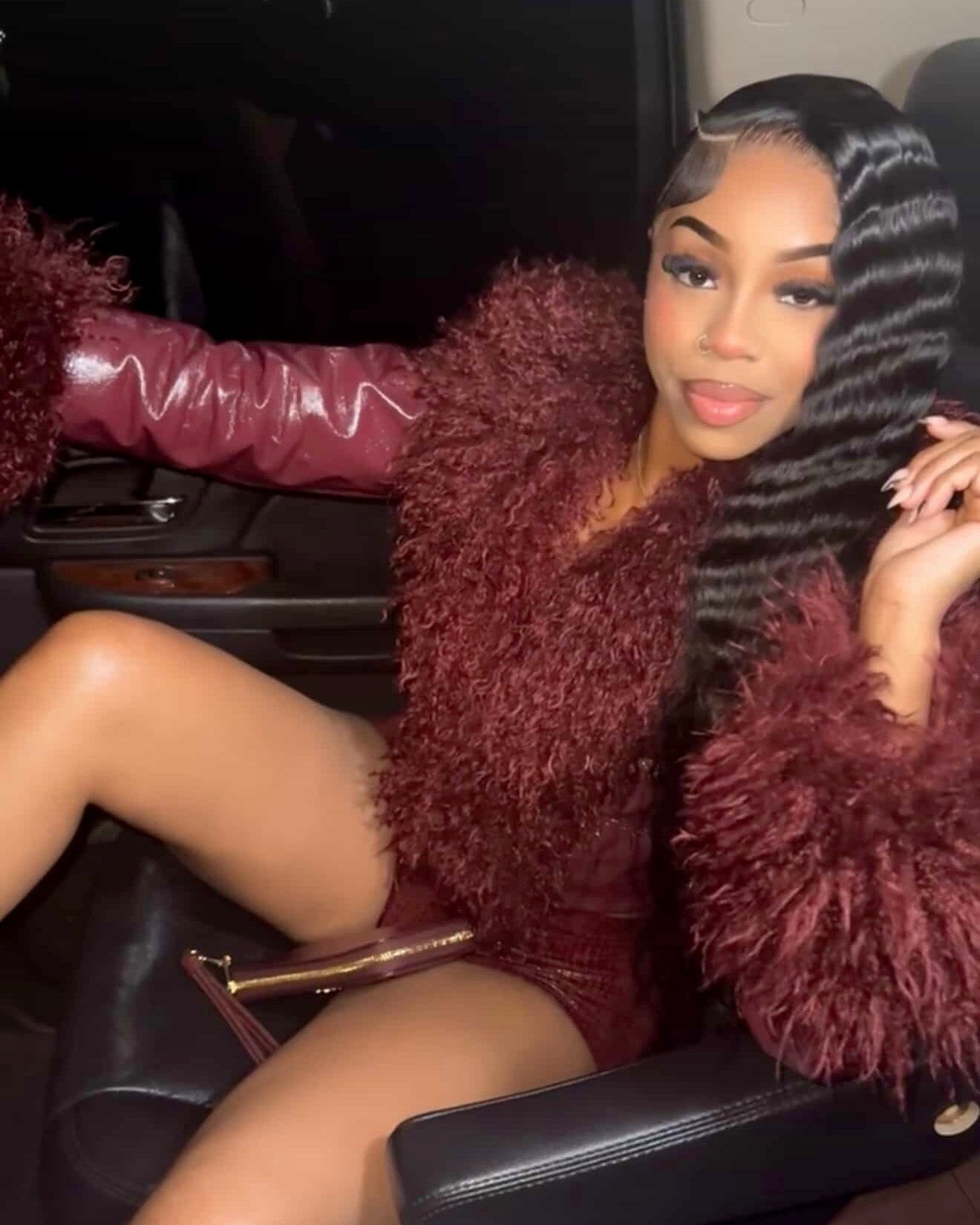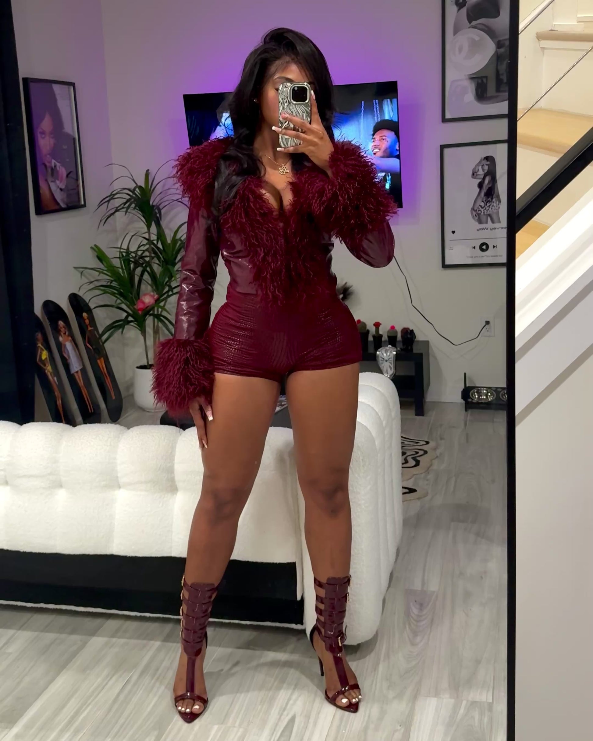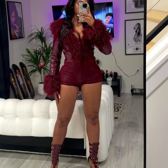 Statement shag collar + cuffs Croc-embossed texture Fully lined for comfort